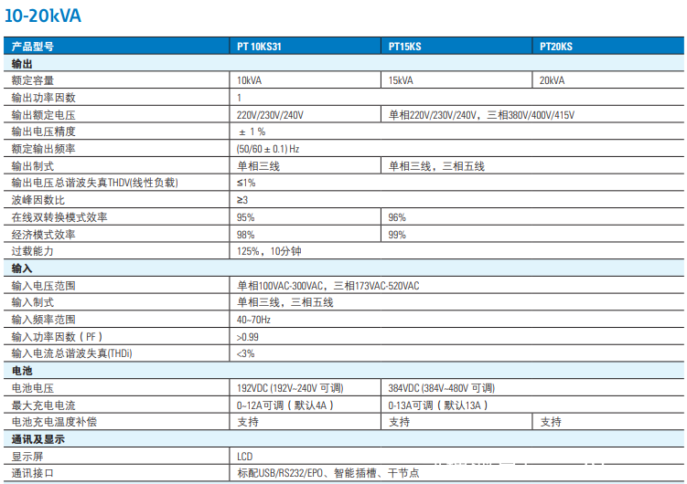 產品采用在線雙變換結構,IGBT整流設計。 容量范圍1kVA-20kVA