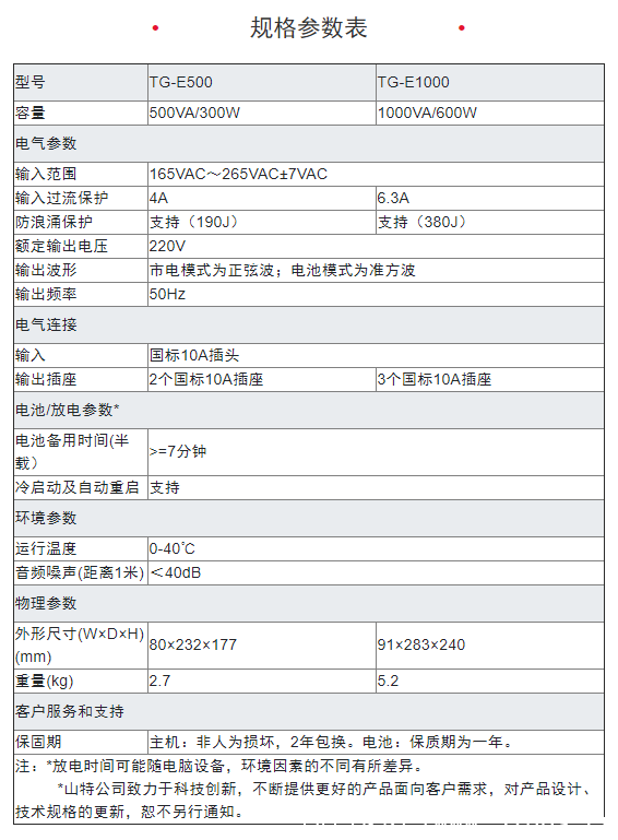 山特后備式TG-E系列UPS---美觀時(shí)尚的“設(shè)備守護(hù)神”。TG-E1000/E500 UPS功能強(qiáng)大,集智慧、安全、可靠 于一身,全面提升消費(fèi)者在產(chǎn)品品質(zhì)、觀感、質(zhì)感方面的使用體驗(yàn)。這款UPS針對(duì)中國(guó)市場(chǎng)電力環(huán)境優(yōu)化設(shè)計(jì),內(nèi)置先進(jìn)的MCU控制單元,使用環(huán)保的ABS塑料,做工精美,有效的解決5種常見(jiàn)的電力問(wèn)題:市電斷電、電壓下陷、浪涌、欠壓、過(guò)壓。TG-E1000/E500 UPS 小身段,大能量,守護(hù)個(gè)人和辦公電腦、商務(wù)設(shè)備等硬件設(shè)備和數(shù)據(jù)的安全。