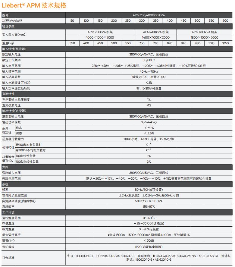 APM 50 - 600 系列UPS是基于新一代50kW功率模塊的模塊化UPS,系統模塊并聯數量更少,減小模塊間并聯環流,大大提升模塊化UPS 的可靠性;其全球480V電壓等級的安規設計,創新的內部架構和生產工藝,進一步提升了系統的可靠性。具有業內模塊化產品最高的可靠性和節能性。
