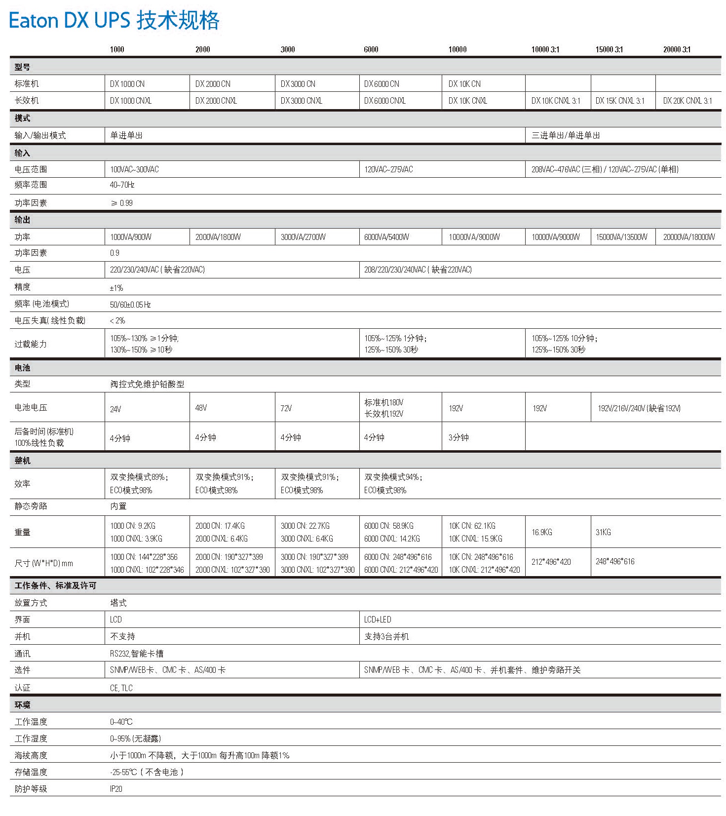 伊頓 DX UPS 是一款雙變換結構的在線式 UPS,可有效保護關鍵任務免受停機、數據丟失和破壞的影響。該 UPS 可適應 110 V 至 296 V 的輸入電壓,同時,其內部集成的整流器和逆變器可將輸出電力與所有異常輸入完全隔離,從而適應惡劣環境。